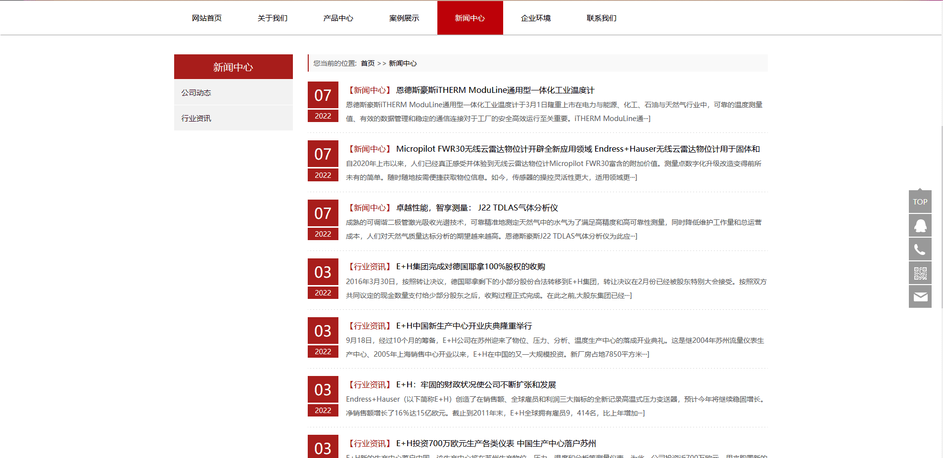 Endress+Hauser(恩德斯·豪斯,简称E+H公司)是一家专业生产及销售工业自动化仪表的跨国集团公司,其产品覆盖了物位(液位)、压力、流量、分析、温度、系统及罐区、记录仪及通讯等工业测量仪表,是世界范围内自动化领域的领导者之一。E+H公司创建于1953年,总部位于瑞士,在世界各地有40多个分支机构,有超过5,800名员工在进行研究、开发、生产、销售和维护工作。在德国、瑞士、法国、美国、日本等世界工业国成立了规模庞大的生产中心,其严格的品质管理和完整的质保体系均已达到ISO9001国际标准。联系市场是开发高质量、高可靠性仪表的重要因素之一,40多年来,E+H公司通过紧密联系市场,不断开发适销对路产品,受益匪浅,并已成为全方位的供应商。